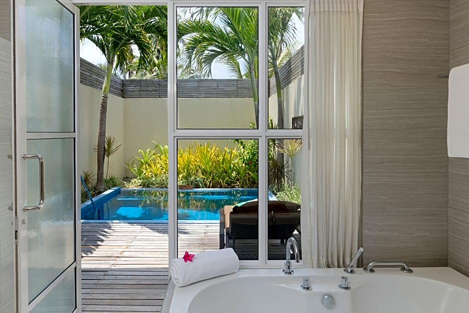 Nestled in verdant tropical gardens, this villa provides a bedroom and a sitting room separated by sliding doors. It has a large open bathroom with a separate bathtub and a private open courtyard complete with a rainshower and an outdoor plunge pool.